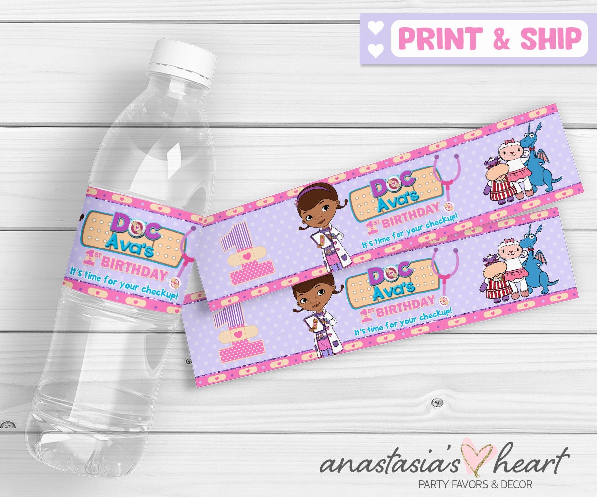 FREE Printable Doc McStuffins Water Bottle Labels Free Doc McStuffins water bottle label printable. Printable is in PDF format for your Doc McStuffins themed party. Prints 3 labels. Free Doc McStuffins labels. HaleGrafx 29k followers More information FREE Printable Doc McStuffins Water Bottle Labels Find this Pin and more on Party Dra Juguetes by ANDREINA EDWARD. Disney Doc Mcstuffins Birthday Water Bottle Label - Doc McStuffins Sold in quantities of five. Labels are self-adhesive and pre-cut. Approximate size of each label is 2" x 8". The fit of the label will vary based on the brand of water. Please verify that these will fit the type of water bottle that you are using. The water bottles that we have tested are: Aquafina 16.9 oz, 12 oz and 8 oz. Dasani 16.9 oz ... Downloadable “Doc McStuffins” Water Bottle Labels ... Downloadable “Doc McStuffins” Water Bottle Labels—Printable Digital File by LifesFrostedMoments on Etsy. lillian. 2k followers ... Doc McStuffins Birthday Water Bottle Label - PrintDParty Click here for more Doc McStuffins Birthday Party Printable This listing is for DIGITAL FILE that come in the form of a high resolution PDF FILE. The file will be email to you within 24 hours or less after all information has been received. + Labels measure 8.5×2 inch and fit most standard size water bottles. There will be 5 labels per page.